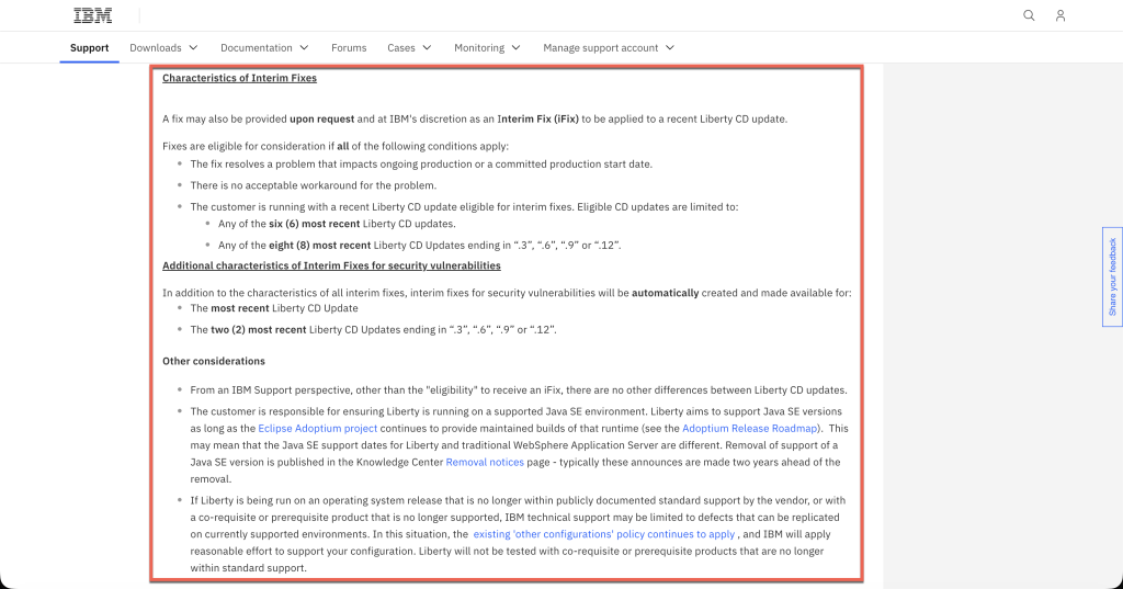 這個內容的意思就是,如果 Liberty 使用的版本是停在 28.0.0.12(2028 年 12 月的版本)的話,一直到 2030 年 12 月的 2 年間,都可以透過向 IBM 尋求支援而取得 iFix,將這些取得的 iFix 安裝在 28.0.0.12 的版本上。
